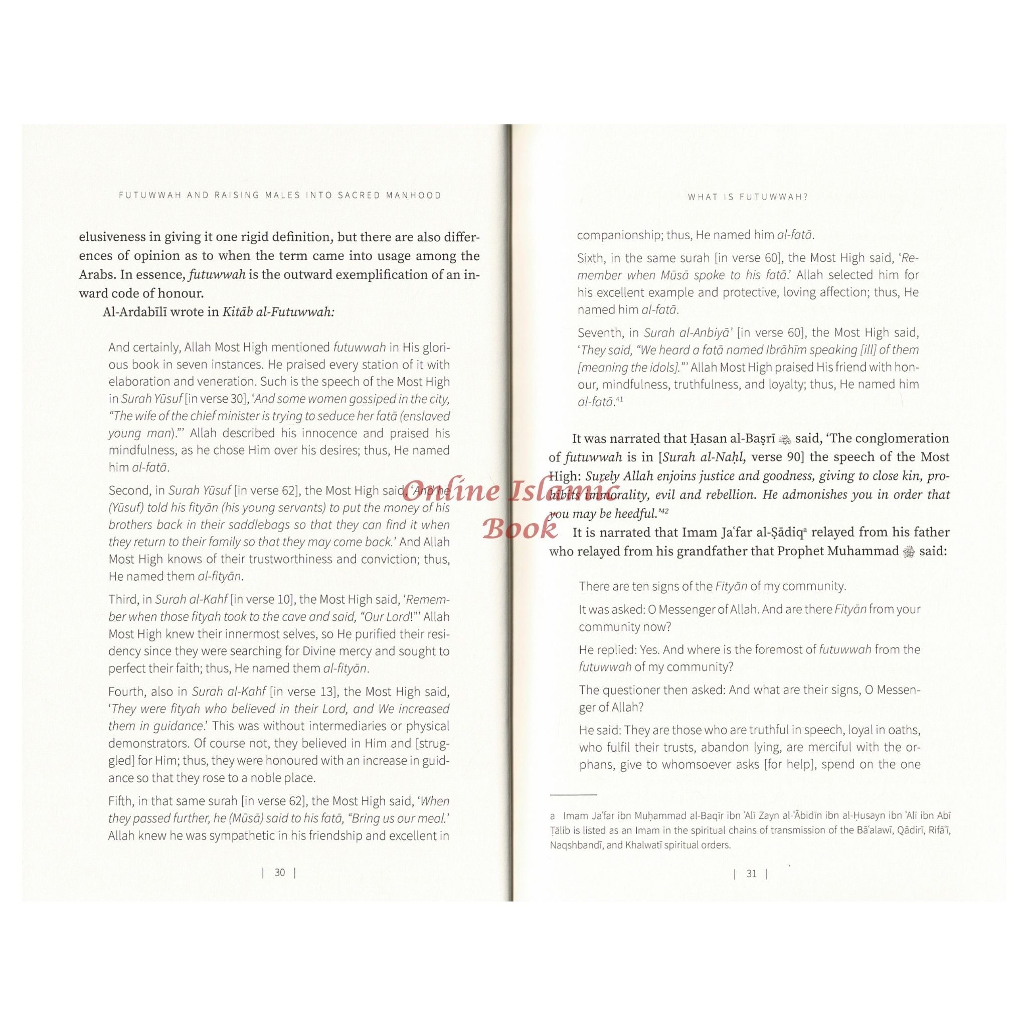This insightful text begins by explaining the linguistic and operational meaning of futuwwah and proceeds to outline the key virtues necessary for cultivating moral strength and emotional maturity. Each section is supported by authentic Qur'anic verses, Prophetic narrations, and sayings of scholars that illuminate the essence of sacred manhood. Futuwwah and Raising Males into Sacred Manhood serves as a call to action - urging Muslim communities to nurture a generation of men who embody honor, humility, and responsibility in every aspect of life.