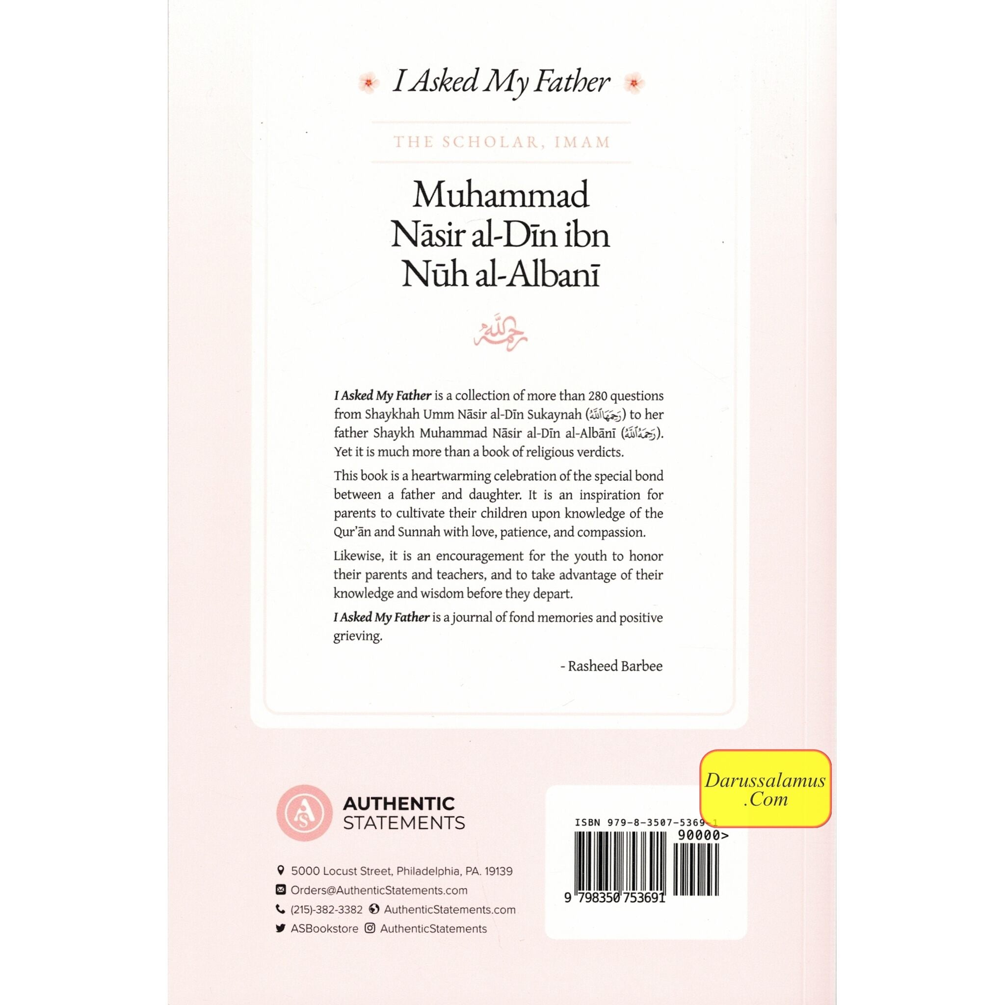 1 Asked My Father is a collection of more than 280 questions from Shaykhah Umm Näsir al-Din Sukaynah (a) to her father Shayich Muhammad Näsir al-Din al-Albani (ú). Yet it much more than a book of religious verdicts. This book is a heartwarming celebration of the special bond between a father and daughter. It is an inspiration for grents to cultivate their children upon knowledge of the Wand Sunnah with love, patience, and compassion. it is an encouragement for the youth to honor parents and teachers, and to take advantage of their edge and wisdom before they depart. asked My Father is a journal of fond memories and positive grieving.