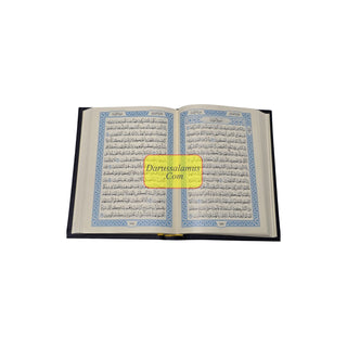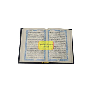 This Quran is printed in the authentic Uthmani script, featuring Arabic only text. Produced by the renowned Medina Printing Press and printed by Majamma Malik Fahad, it is the same Mushaf found in Haram Makkah, Madinah, and many masajid around the world. This Pocket Plus size edition comes in a beautiful blue color, with deluxe hardbound cover and fine quality paper for a smooth, comfortable reading experience.