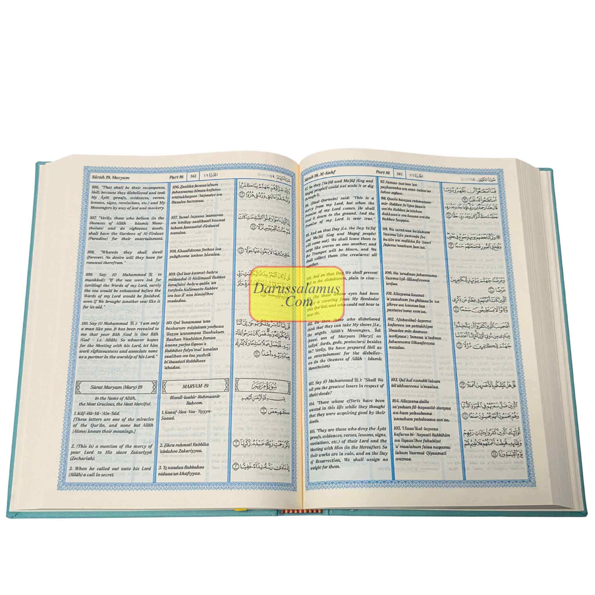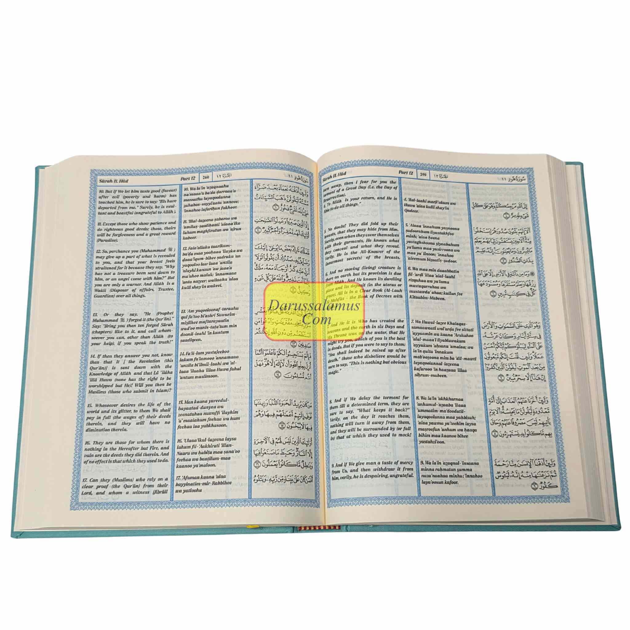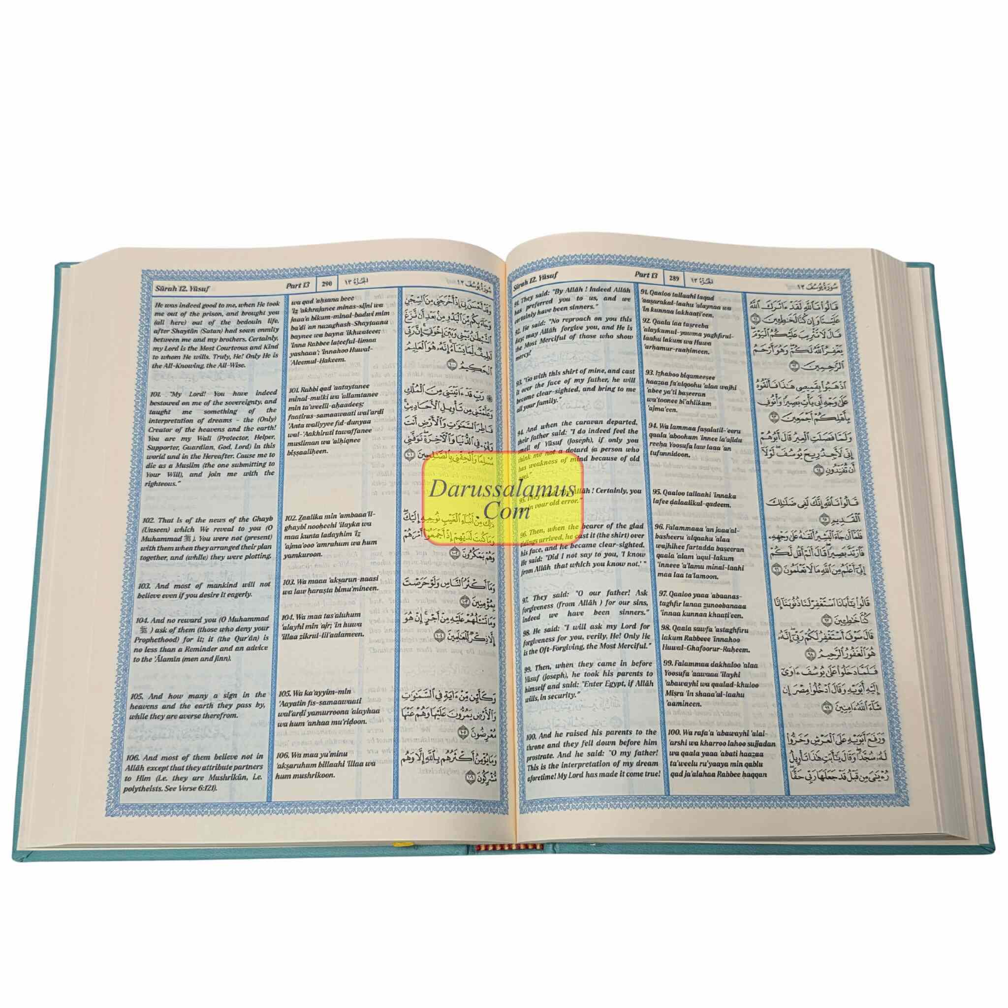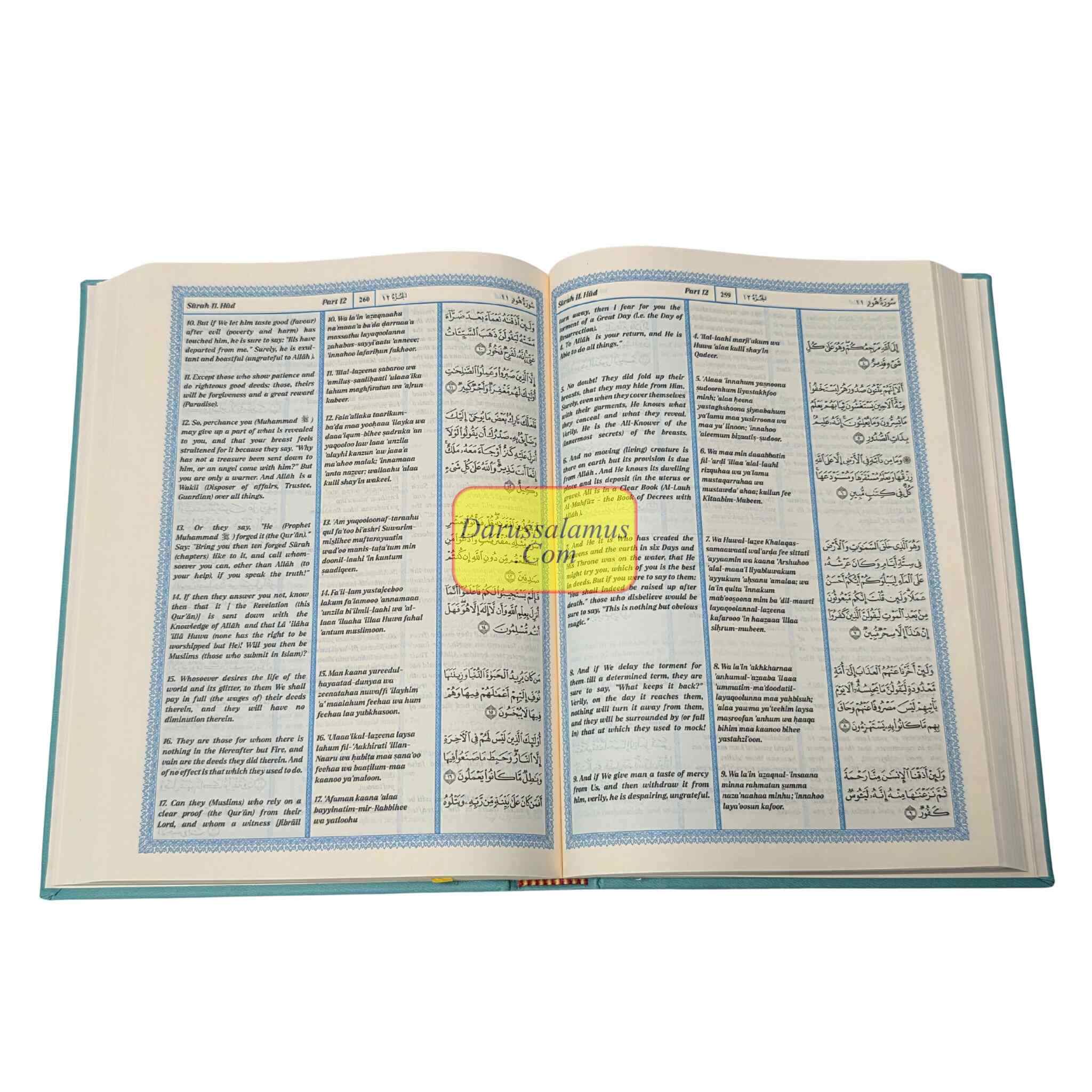 The heavenly message is presented in three different formats in this special edition of The Noble Quran: the Arabic original, a transliteration into Roman type, and an English translation based on the famous King Fahad Compound style. The transliteration, which was created specifically for students and non-Arabic speakers, enables readers to precisely recite the Quran while gradually getting familiar with the Arabic alphabet.