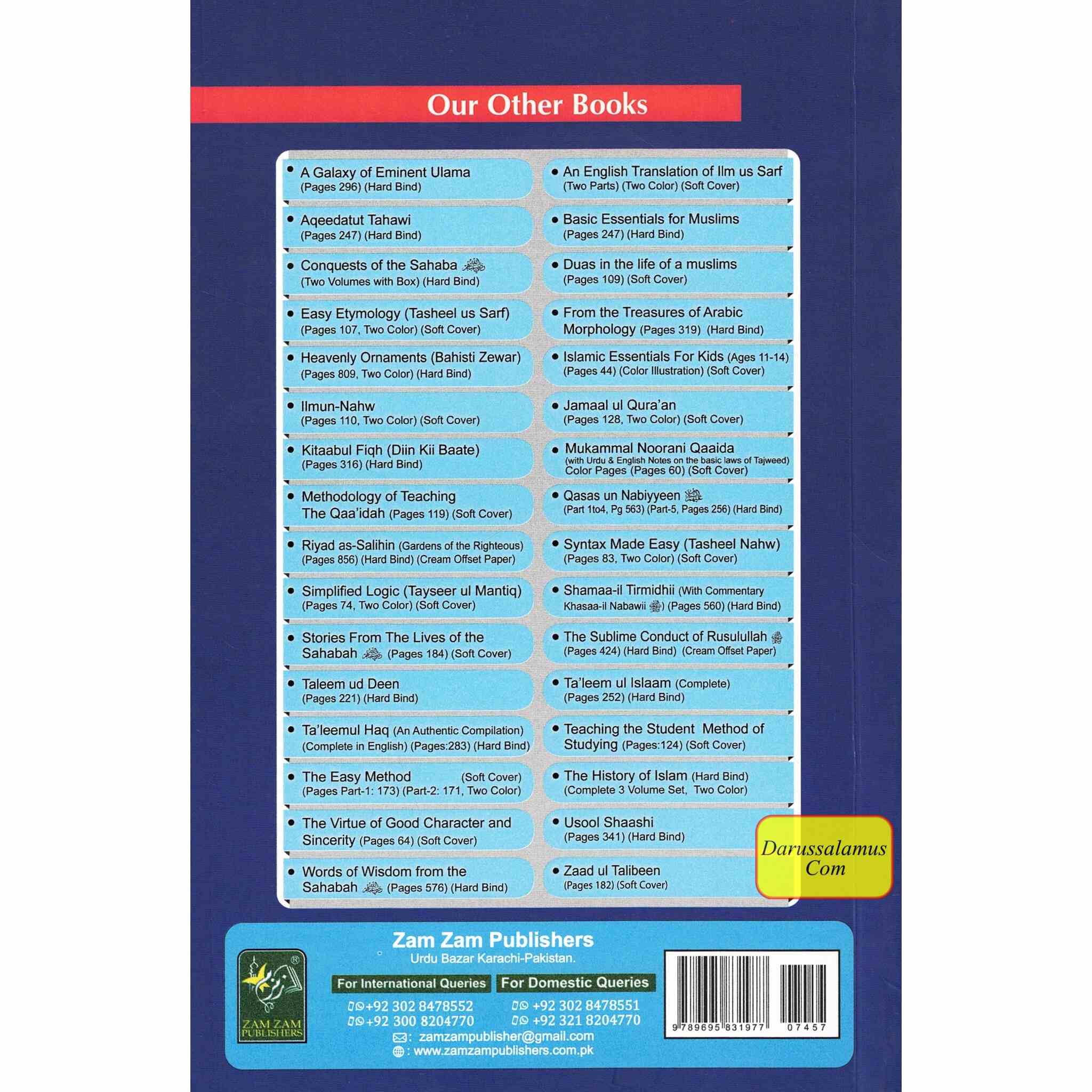 An essential resource for beginners of classical Arabic, Safwatul Masadir presents the most commonly used verbs and nouns arranged by their verb patterns (e.g., Bab Nasara, Bab Daraba). Each verb is shown in its root, past, present/future, imperative, and prohibitive forms, with English translations. Widely used in Arabic grammar courses, the book helps students build a strong working vocabulary for reading traditional texts. This English edition features clear two-color printing and includes both classical and modern Arabic words with their meanings. Compiled by Maulana Mushtaq Charthawali, this work remains a trusted tool for mastering Arabic verb forms.